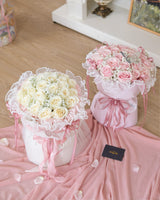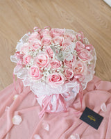 Lovely Puff features delicate blush pink roses beautifully arranged with airy baby’s breath, creating a gentle and romantic expression of love. Finished with soft lace accents, flowing ribbons, and a subtle butterfly detail, this arrangement feels light, dreamy, and full of tenderness.